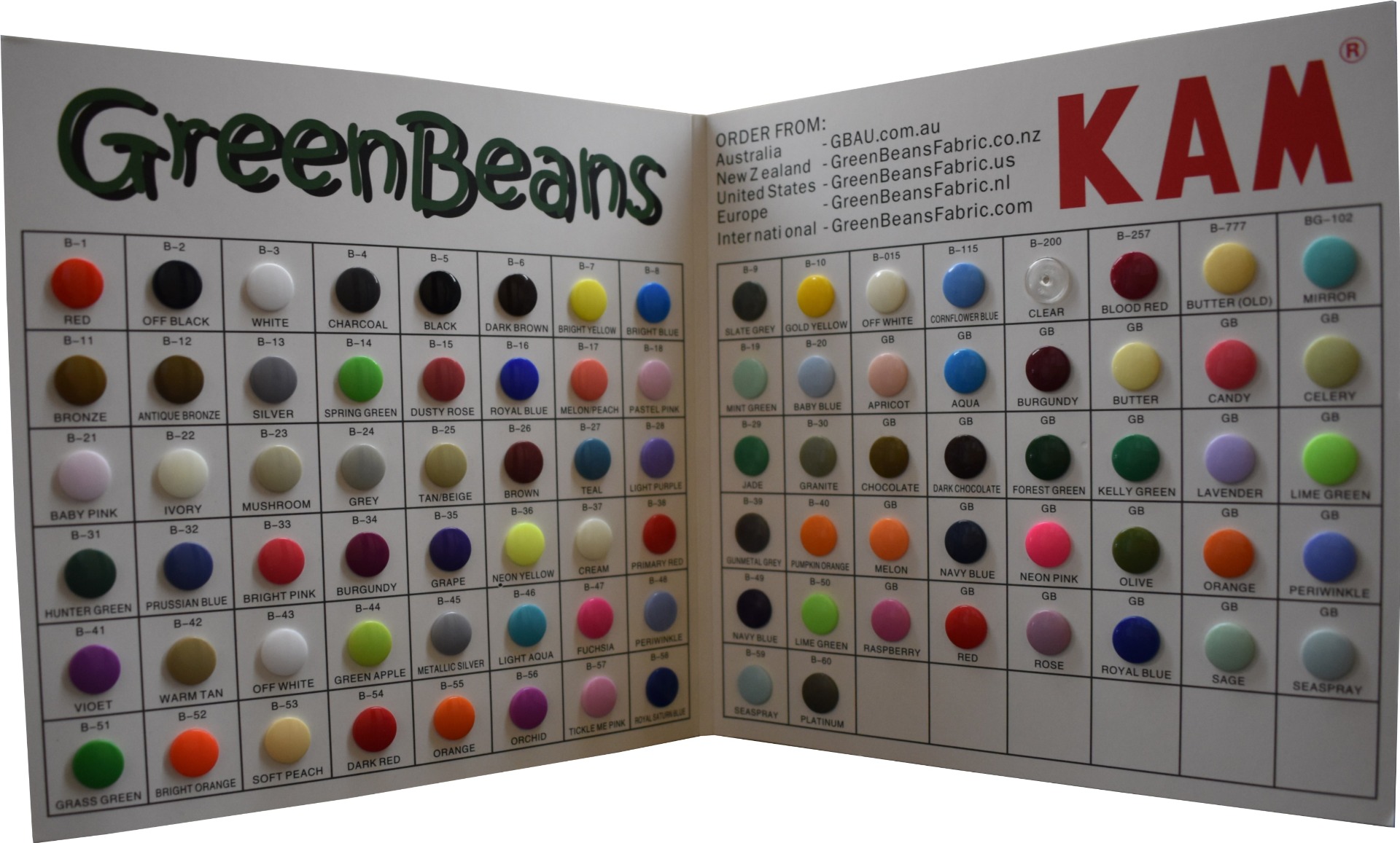 Our custom colour range of snaps are included, prefaced with "GB", which are produced exclusively for GreenBeans to match the same colour of Greenbeans PUL.